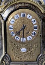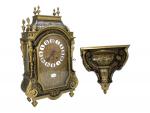 CARTEL et sa CONSOLE d'applique en marqueterie Boulle de laiton et ornementation de bronzes dorés, le cadran émaillé signé "L. Marchand", le sommet coiffé de pots à feu