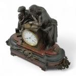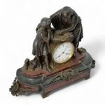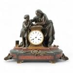 PENDULE en bronze patiné et doré figurant une allégorie de la connaissance, reposant sur une base en marbre rouge griottes à inclusions d'oeil de perdrix et marbre noir.