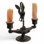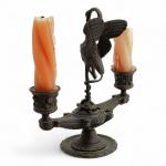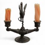 BOUGEOIR en bronze à deux bras de lumière, au centre un oiseau fantastique sur une tortue Fin XIXème H.: 20.5 cm