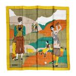2 CARRES soie : Jacques Fath la golfeuse 90x90 (taches), on y joint un carré Paul Smith jeune skieuse 60x60