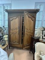ARMOIRE en noyer mouluré et filets de marqueterie, à montants cannelés, ouvrant par deux vantaux...