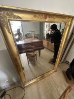 MIROIR à cadre en bois stuqué et doré à décor de rinceaux et palmettes. Epoque Restauration (accidents) 161 x 118 cm