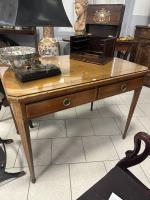 BUREAU PLAT en placage de noyer, de forme rectangulaire à pans coupés, ouvrant en ceinture par deux tiroirs, style Louis XVI (accidents)