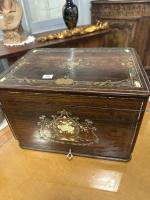 Coffret de cave à liqueur en bois de placage et marqueterie d'étain et de cuivre. Epoque Napoléon III (manques) 22 x 25 x 34 cm