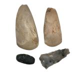 Lot de 2 haches polies et un micro-ciseau, silex beige et pierre verte, France, Néolithique, de 4 à 8 cm ; il y est joint un petit tranchet taillé.