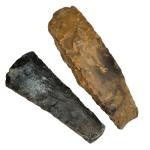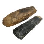 Lot de 2 haches taillées à section quadrangulaire, silex marron et noir, petits éclats, Danemark, Chalcolithique, 14,5 cm et 17,5 cm. Expert: Daniel Lebeurrier