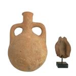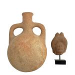 Lot comprenant une gourde lenticulaire et une tête d'Harpocrate, Afrique du Nord, période carthaginoise et Alexandrie, période romaine, de 5,5 à 14 cm. Expert: Daniel Lebeurrier