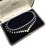 COLLIER draperie en or gris 750 millièmes serti d'une ligne de diamants taillés en rose, supportant en pampille vingt-cinq diamants ronds de taille ancienne en chute.