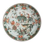 CHINE Compagnie des Indes Plat rond de forme calotte en porcelaine à décor famille verte d'un oiseau branché, fleurs, poissons et langoustines XVIIIème, époque Kangxi D.: 28 cm