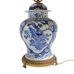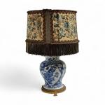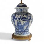 CHINE Vase couvert en porcelaine à décor bleu blanc de personnages, monté en lampe H. totale avec abat-jour: 72.5 cm (percé)