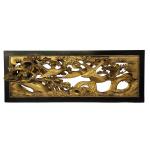 CHINE Panneau en bois sculpté, peint et doré figurant des oiseaux sur des branchages fleuris 39.5 x 106.5 cm (accidents)