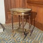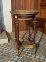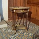 Table de salon de forme ovale en acajou sculpté et mouluré ouvrant à un tiroir en ceinture, riche ornementation de bronze doré et plaques de Wedgwood, dessus de marbre enchâssé, les montants cannelés réunis par une tablette d'entretoise à galerie ajourée