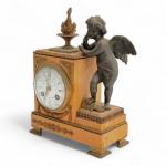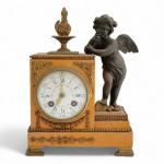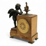 PENDULE en marbre jaune de Sienne et bronze patiné et doré, représentant un angelot appuyé sur une borne surmontée d'une flamme, le cadran émaillé Style Louis XVI, XIXème H.: 25.5 cm l.: 18.5 cm
