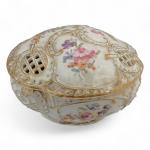 SAXE Boite couverte ronde formant brule parfum en porcelaine à décor polychrome et or de fleurs H.: 7.5 cm D.: 13.5 cm