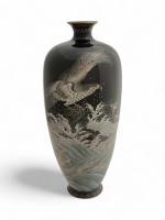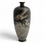 JAPON Vase en métal argenté à décor émaillé polychrome d'un aigle sur une vague H.: 30.5 cm (dans une boite)