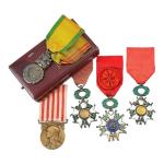 France Lot de 5 décorations : 3 Légion d'honneur (dans l'état), Médaille militaire avec écrin, Commémorative 14/18. Rubans. Expert: Gaëtan Brunel