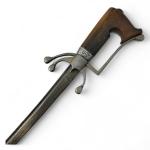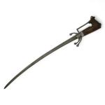 SABRE marocain dit Nimcha. Poignée en corne. Monture en fer. Arc de jointure et trois antennes boulés. Lame courbe, à gouttière. ABE SF Expert: Gaëtan Brunel