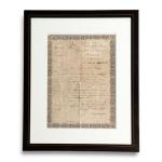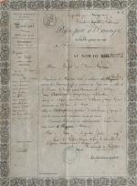 PASSE-PORT à l'étranger valable un an, daté du quatre juin 1849. 40 x 28.5 cm à vue (biffé pour adapter un ancien document royal, pliures, piqûres)
