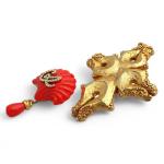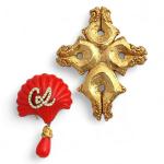 Christian LACROIX 2 BROCHES en métal doré, strass et pate de verre colorée, signée haut croix 10.5 cm, haut coquillage 8 cm
