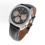 Cadran noir avec index et aiguilles luminescentes, 3 compteurs pour l'indication des heures, minutes et secondes, minuterie chemin de fer, graduation 1/5e de seconde, échelle tachymètre, signé