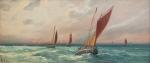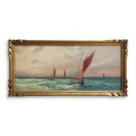 Emile GAUFFRIAUD (1877-1957) Voiliers de Concarneau en pleine mer Huile sur panneau signée en bas à gauche 21 x 49.5 cm à vue