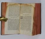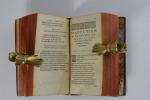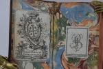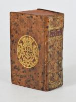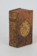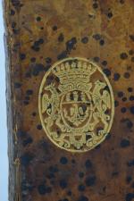 DU BELLAY, Joachim. Les oeuvres françoises. Revues et de nouveau augmentées de plusieurs poésies non encore auparavant imprimées. Rouen, George l'Oyselet, 1592. Petit in-12, (12)-583 (pour 581)-(1) ff., signatures ã12, A-Z12, Aa-Zz12, Aaa-Bbb12, Ccc6. Reliure ancienne en veau moucheté, dos lisse orné, armes sur les plats de Fleuriau d'Armenonville (Jean-Baptiste) membre de l'Académie française mort en 1732 (Guigard I-218), tranches rouges, ex-libris "Bibliothecae Ferrandianae" sur le contreplat et celui de Louis Blancard archiviste sur la garde, inscriptions à l'encre sur le feuillet de titre, traces de mouillures marquées sur la première moitié et sur les 30 derniers feuillets, petite galerie de vers en marge d'environ 20 feuillets, mors partiellement fendus.