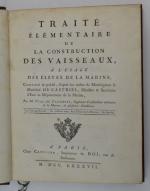 (MARINE) VIAL DU CLAIRBOIS, (H.-S.). Traité élémentaire de la construction des vaisseaux à l'usage des élèves de la marine. Paris, Clousier, 1787. In-4, (4)-308 pp., 20 planches dépliantes, ex-libris du Baron de Crisenoy. Reliure demi-chagrin du XIXe siècle, minimes frottements aux mors, mouillures en marge sup. des dernières planches. Polak 9434 annonce la parution en 1805 d'un deuxième volume.