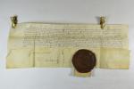 HENRI II (Roi de France, 1519-1559). Lettre patente du 8 mars 1547 signée par le secrétaire d'État Claude de l'Aubespine portant que tous exemptés, présidents, conseillers, universitaires et autres privilégiés de la ville de Toulouse seront cotisés aux tailles. Grande pièce en vélin (52.5 x 29 cm) scellé par le grand sceau en majesté du roi, pendant sous queue en parchemin, contre-sceau aux armes de France, important manque en partie haute du sceau.