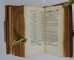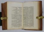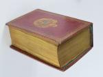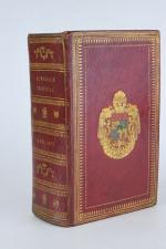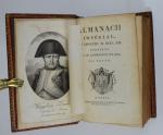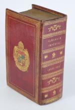 [Empire] TESTU. Almanach impérial an bissextil M. DCCC. XII, présenté à S. M. l'Empereur et Roi, par Testu. Paris, Testu, 1812. Fort in-8 de 975 pp., portrait de Napoléon Ier ajouté en frontispice. Reliure de l'époque en maroquin rouge à grain long, dos orné de roulettes, d'aigles et d'abeilles dorés, plats ornés d'un encadrement de roulettes, roulette intérieure et sur les coupes, armes dorées et peintes au centre des plats, tranches dorées, gardes en soie verte, corps d'ouvrage décalé de la reliure, traces de mouillures plus ou moins importantes en tête des feuillets sinon très bel exemplaire.
