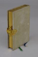[Reliure] Livre de mariage. Paris, Curmer, s.d. (vers 1850-1860). 132 x 90 mm, titres et calendrier non paginés, 364 pp., gravures hors-texte, une page de titre est gravée et rehaussée en couleurs. Reliure de l'éditeur en velours ivoire, fermoir et décoration du dos en métal doré, gardes de tabis ivoire, tranches dorées, chemise et étui, dos de la chemise et étui défraîchis.