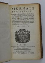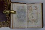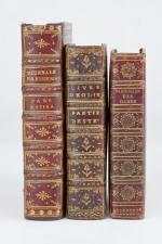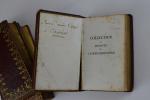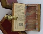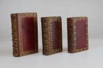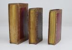 [Reliure] Lot de 3 livres dont un livre-boîte. 1 - Diurnale parisiense. Pars aestiva. Paris, 1787. 137 x 80 mm. Reliure de l'époque en maroquin rouge, plats encadrés de roulettes dorées, dos orné, tranches dorées, petit manque à la coiffe sup., 3 coins ouverts, traces d'humidité dans la marge, rousseurs. 2 - Petit paroissien des dames. Paris, Le Fuel, (1822). 114 x 75 mm. Reliure de l'époque en maroquin rouge, plats encadrés d'une roulette doré, dos orné, tranches dorées, coupes et mors frottés, coins ouverts, une ficelle de la première charnière cassée, rousseurs. 3 - (Livre-boîte) Nouveau livre d'église à l'usage de Rome pour la commodité des laïques. Partie d'été. Paris, Collombat, 1762. 120 x 65 mm. Reliure de l'époque en maroquin rouge, plats encadrés d'une répétition de petits fers, oiseaux et fleurs, dos orné, tranches dorées, seuls les premiers feuillets ont été conservés.