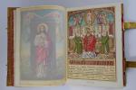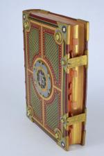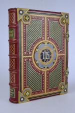 Missale Romanum. Ex decreto SS. Concilii Tridentini restitutum, S. Pii V. Pontificis Maximi jussu editum, Clementis VIII., Urbani VIII. et Leonis XIII auctoritate recognitum. Rome,Tournai, Desclée, Lefebbre et soc., 1904 (pour 1932) In-4, XXXVIIJ-(4)-552-207-(5)-17-(27) pp., frontispice,page de titre et 1 pl. en chromolithographie, illustrations en n/b. Reliure en maroquin, plats ornés d'une plaque centrale, de cabochons et de fermoirs en métal doré et émaillé, décor en 4 panneaux géométriques mosaïqués et richement dorés, fermoirs en métal doré ciselé, tranches dorées, double garde, la première en tabis, inscription sur le premier feuillet blanc, très bel exemplaire en parfait état.