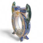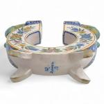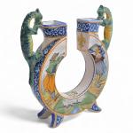 HR à Quimper Gourde annulaire en faïence à décor de sonneurs dans des paysages et fleurs, les prises zoomorphes, marquée H.: 37.5 cm l.: 37 cm (quelques sauts d'émail)