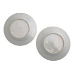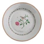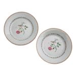 CHINE Compagnie des Indes Paire d'assiettes rondes en porcelaine à décor famille rose d'un oiseau branché sur une fleur, bordées d'un liseré doré XVIIIème Diam : 23 cm (petites égrenures, fêle en étoile)