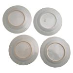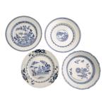CHINE Lot de quatre assiettes rondes à décor en camaïeu bleu de vue paysagée et décor naturaliste XVIIIème D.: 22.5 à 23 cm (petits éclats)