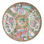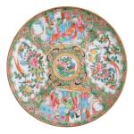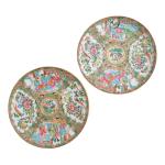 CHINE Canton Paire d'assiettes rondes en porcelaine à décor floral et de scènes de cours en réserve, bordées d'un liseré doré D.: 24.5 cm (infimes sauts d'émail)