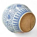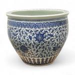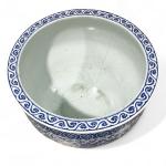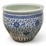 CHINE Important aquarium ou cache pot rond en porcelaine à décor bleu blanc de fleurs, feuillage et rinceaux H.: 58 cm D.: 70 cm (fêles, petits éclats)
