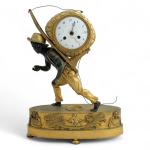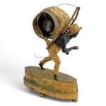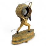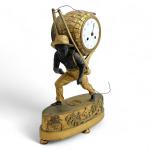PENDULE au portefaix en bronze doré et patiné, figurant un personnage portant sur son dos un ballot dans lequel s'inscrit le cadran émaillé