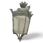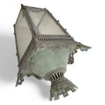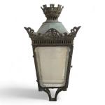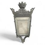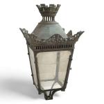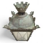 LANTERNE en bronze à section carrée et plaques de verre, sommée d'une couronne fantaisiste représentant des tours de château H. : 84 cm (accidents aux verres)