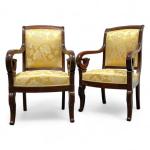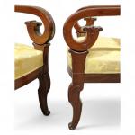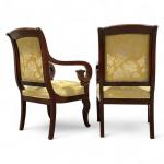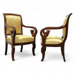 Paire de FAUTEUILS en acajou sculpté et mouluré, les supports d'accotoirs en corne d'abondance Epoque Louis Philippe
