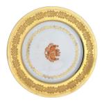 PARIS Assiette ronde en porcelaine à décor or et orange d'un monogramme et frises XIXème D.: 24 cm