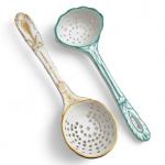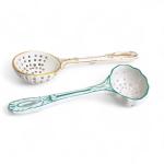 Deux CUILLERES A SAUPOUDRER en porcelaine, l'une à décor or, l'autre à décor vert XIXème L.: 18.5 et 21 cm