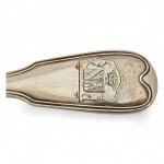 CUILLERE A SAUPOUDRER en argent, modèle filets, gravée d'armoiries d'alliance sous une couronne de comte et la devise "J'attends, je prétends et j'espère en tout temps" de la famille de Guillebon