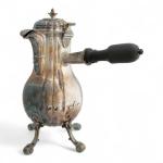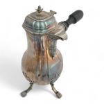 CHOCOLATIERE en argent, reposant sur quatre pieds en enroulements et attaches en palmette, le bec verseur orné de coquilles, la bordure du couvercle moulurée de godrons, l'anse en bois noirci