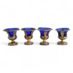 Suite de quatre SALERONS en argent à décor de filets et palmettes, les intérieurs en verre bleu Paris, 1819-1838 H.: 8 cm Poids net: 296 gr (accidents à l'un)