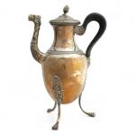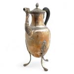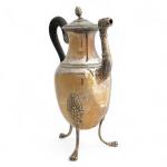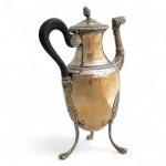 VERSEUSE couverte en argent uni, à décor de frises, reposant sur trois pieds griffes à attaches en palmettes, le bec verseur zoomorphe, l'anse en bois noirci, anciennement gravée d'armoiries d'alliance sous une couronne de marquis