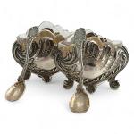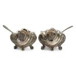 Paire de SALERONS en argent et verre, on y joint une paire de pelles à sel en argent Minerve H.: 4.8 cm Poids net: 45 gr