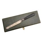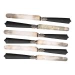 Suite de six COUTEAUX A FRUITS, les lames en argent, les manches en bois Minerve. Orfèvre: Pierre QUEILLE (1834-1846) L.: 20 cm Poids brut: 179 gr (dans un écrin à la forme)