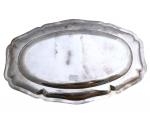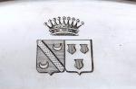 PLAT ovale en argent, modèle filets contours, gravé d'armoiries d'alliance sous une couronne de comte Minerve: Orfèvre: Henri LAPPARRA, insculpation en 1923 29.5 x 46.5 cm Poids: 954 gr