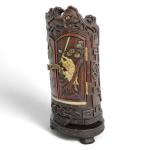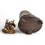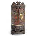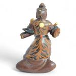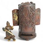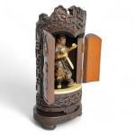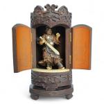 Japon, vers 1850 Petit coffret à deux vantaux ouvrant sur un okimono représentant Fudo Myoo en bois laqué avec incrustation de nacre et de corail brandissant son épée. H. 20 cm
